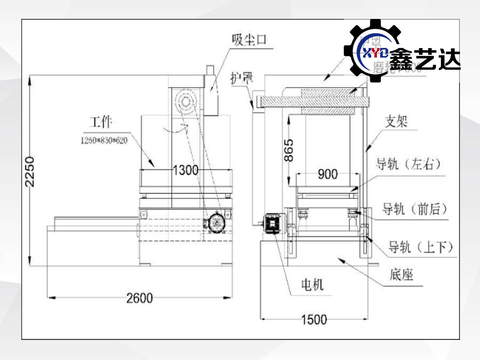 磨輪與工件平臺(tái)間距865mm,滿足工件850mm高度的放置需要,如有不同高度,可以通過自制的墊塊來解決。工件平臺(tái)前后移動(dòng)距離1250mm,滿足工件長(zhǎng)度方向的的拋光需要,同時(shí)工件平臺(tái)上安裝有壓板,固定工件。