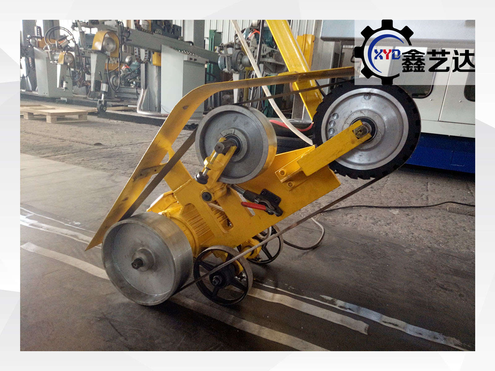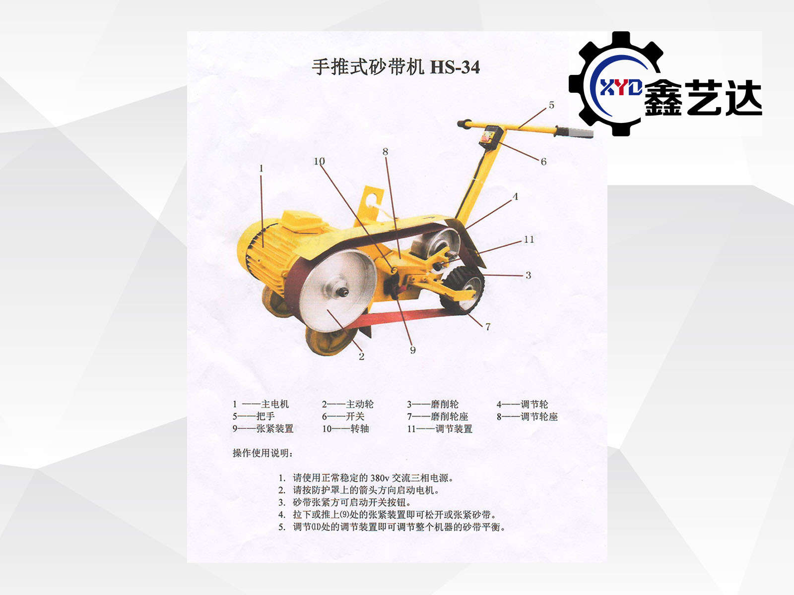 該機主要由砂帶驅(qū)動機構(gòu)、接觸輪(磨輪)系、磨頭體、支座、支腳、腳輪、砂帶、手推桿及電氣控制系統(tǒng)等組成。電動機直接將動力傳遞給驅(qū)動輪,帶動砂帶高速旋轉(zhuǎn),通過張緊機構(gòu)張緊砂帶,用接觸輪進行磨削加工。